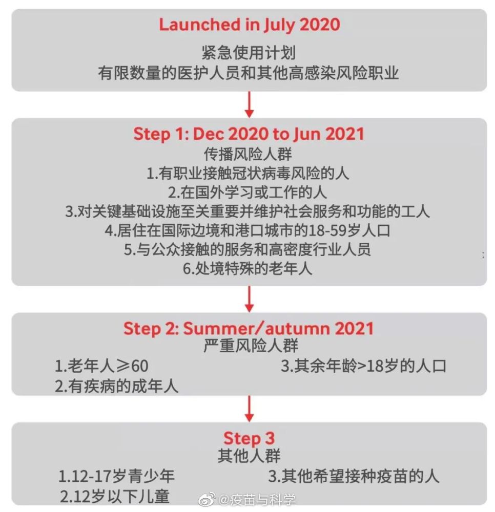 中国的疫苗接种计划如下图。该计划的重点人群排序,与世界卫生组织为其他国家推荐的排序不同。中国的计划里,重症风险最高的人群没有在医护人员之后立即接种。