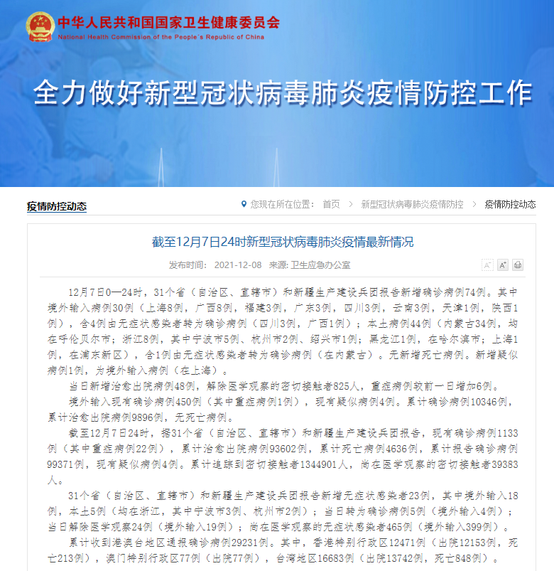 截至12月7日24时,据31个省(自治区、直辖市)和新疆生产建设兵团报告,现有确诊病例1133例(其中重症病例22例),累计治愈出院病例93602例,累计死亡病例4636例,累计报告确诊病例99371例,现有疑似病例4例。累计追踪到密切接触者1344901人,尚在医学观察的密切接触者39383人。