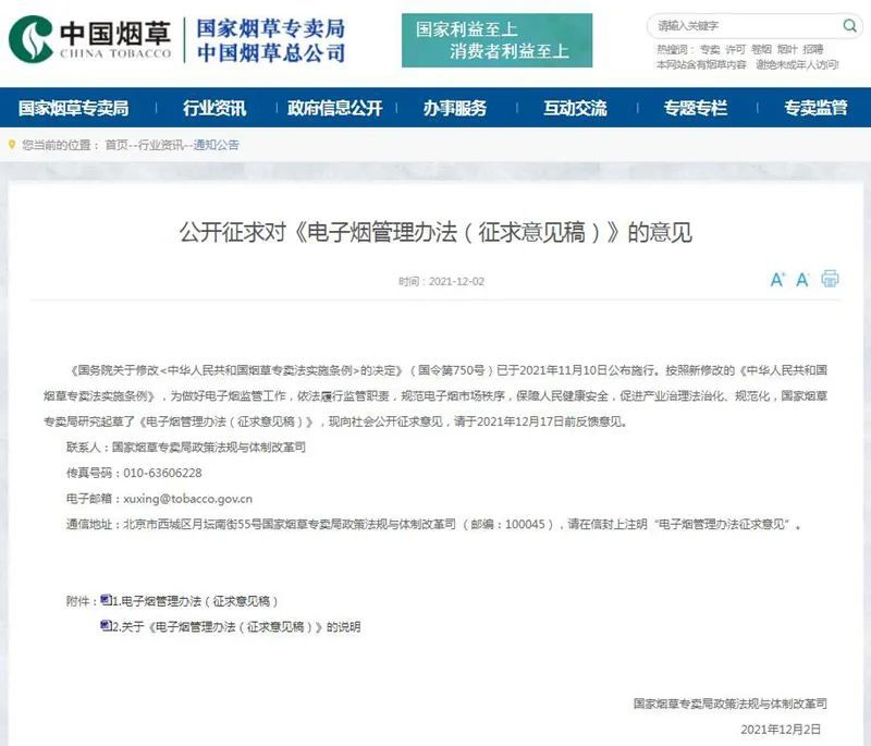 12月2日,国家烟草专卖局公布的《电子烟管理办法(征求意见稿)》提到,国务院烟草专卖行政主管部门建立全国统一的电子烟交易管理平台。今后电子烟将参照卷烟进行管理,从生产、批发到零售等环节,都要取得许可证。