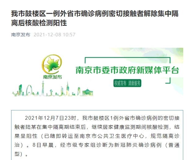 2021年12月7日23时,我市鼓楼区1例外省市确诊病例的密切接触者陆某在集中隔离期结束后,继续居家健康监测期间核酸检测,结果呈阳性(已随即转运至南京市公共卫生医疗中心,规范隔离诊治)。8日早晨,经市级专家组诊断为新冠肺炎确诊病例(普通型)。