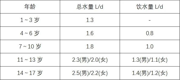 2013年,中国营养学会在《中国居民膳食营养素参考摄入量》指出,0~6个月婴幼儿应进行母乳喂养,不需要额外补充水分。其他年龄详见下表: