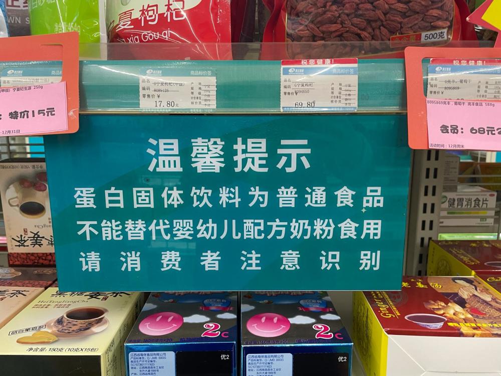 消费者往往容易对固体饮料有认知误区,总认为这类食品有特殊功能。在示范区的药店里,消费提示直接粘贴在固体饮料售卖区,让消费者一眼就能看到:“蛋白固体饮料为普通食品,不能替代婴幼儿配方奶粉食用,请消费者注意识别”。