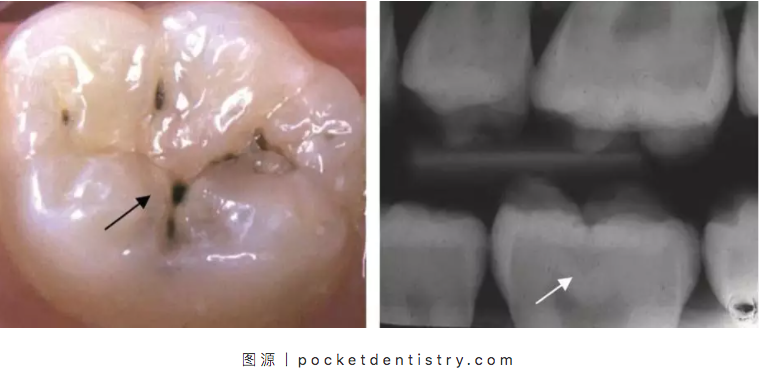 我们的牙釉质在酸的作用下脱矿,唾液让牙釉质发生再矿化,一旦这个再矿化速度跟不上破坏速度了。这个细菌就不断往牙齿深部腐蚀,并且很多龋齿表面会矿化形成一个外壳,阻止唾液的进一步渗入,其实这时小黑点小黑线底下可能已经坏得很深了。