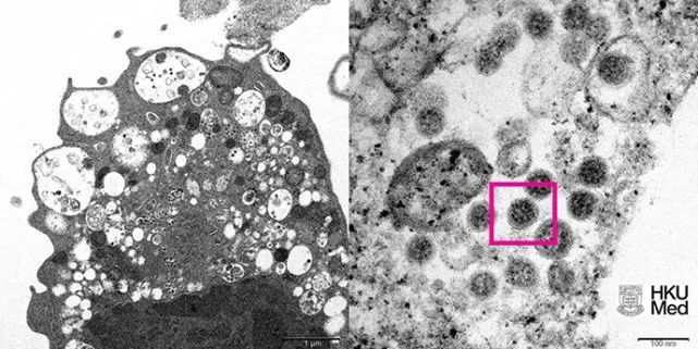(图右)高倍电子显微镜下受感染的Vero E6细胞。照片显示病毒颗粒表面呈现皇冠形的刺突蛋白(见红框)。