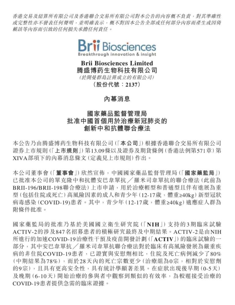 12月9日,腾盛博药发布公告,国家药监局已批准公司的单克隆中和抗体安巴韦单抗/罗米司韦单抗的联合疗法(此前为BRII-196/BRII-198联合疗法)上市申请,用于治疗轻型和普通型且伴有进展为重型(包括住院或死亡)高风险因素的成人和青少年(12-17岁,体重≥40kg)新型冠状病毒感染(COVID-19)患者。其中,青少年(12-17岁,体重≥40kg)适应症人群为附条件批准。这是我国首家获批的自主知识产权新冠病毒中和抗体联合治疗药物。屡屡公布药物研发顺利进展,腾盛博药-B近20个交易日以来已累计涨逾120%。