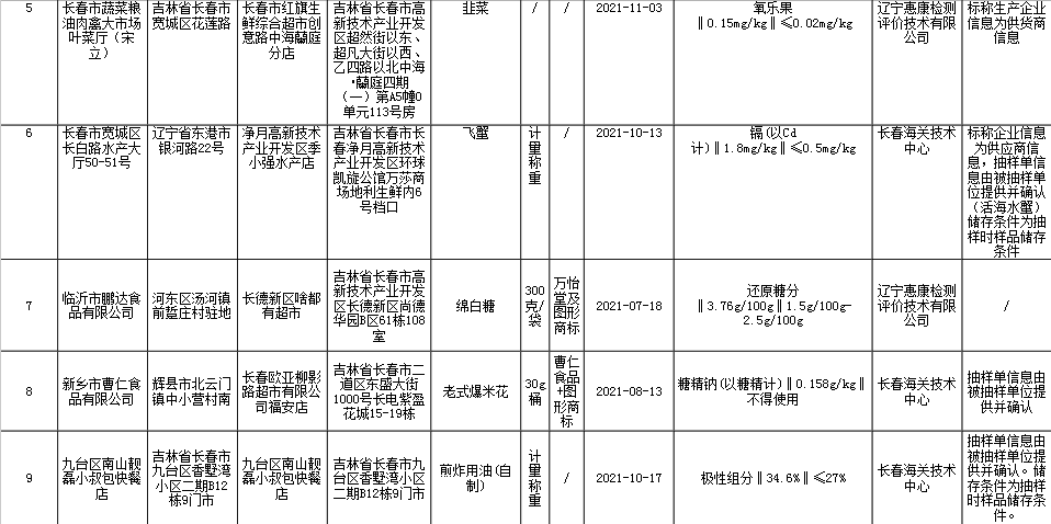 近期,长春市市场监督管理局组织抽检4类食品共150批次样品,其中:合格样品141批次,不合格样品9批次。不合格样品中:食用农产品批次6批次、薯类和膨化食品1批次、食糖1批次、食用油、油脂及其制品1批次。