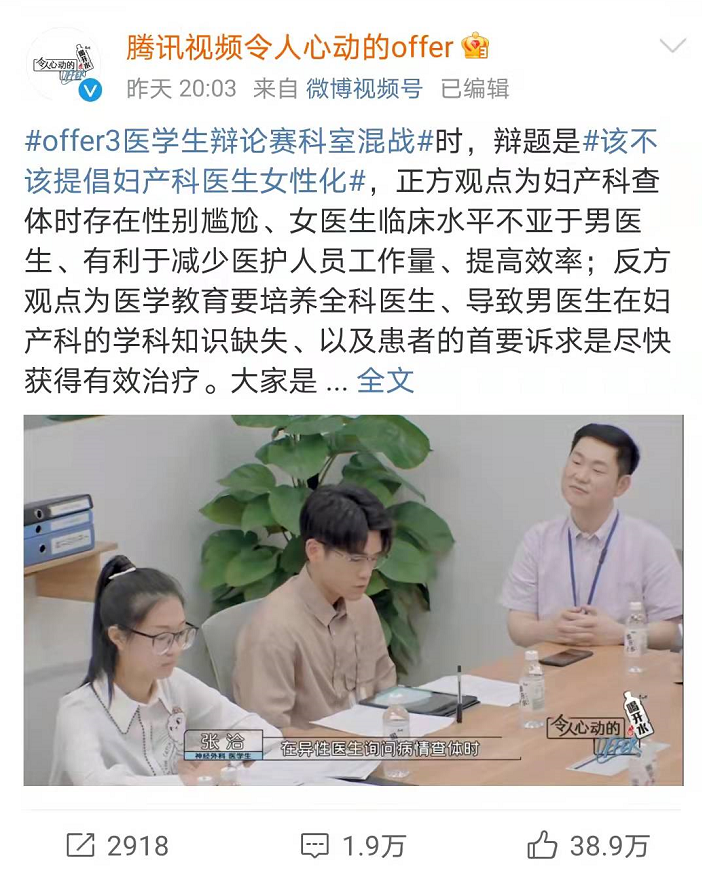 昨天(12月7日),《令人心动的offer3》因一场辩论赛――#该不该提倡妇产科医生女性化#引发网络热议。