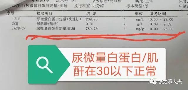 那么,既然这个指标不能准确反映出肾脏的早期损伤,那什么指标可以准确反映出肾脏的早期损伤呢?张大夫的建议是查一下尿微量白蛋白/尿肌酐。因为人体内在正常情况下或肾轻度受损时,尿肌酐排出量基本保持恒定。虽说尿微量白蛋白和尿肌酐的排出量都受到个人因素影响,不同个人两个指标波动比较大,但是两个指标的比值还是相对能够保持恒定的, 因为这个特点,所以尿微量白蛋白/尿肌酐这个比值更能准确反映出肾脏的早期损伤。所以,张大夫推荐高血压患者、糖尿病患者都要注意查一下尿微量白蛋白/尿肌酐(比值如下图)这个指标,因为它能看出来高血压、糖尿病是不是对你的肾脏已经产生了早期的伤害,而且还可以给与后期对症处理和治疗,给与正确治疗治疗后很多人这个指标还可以恢复正常,这也说明肾脏的早期损伤得到了改善,何乐为不为呢。您说对吗?