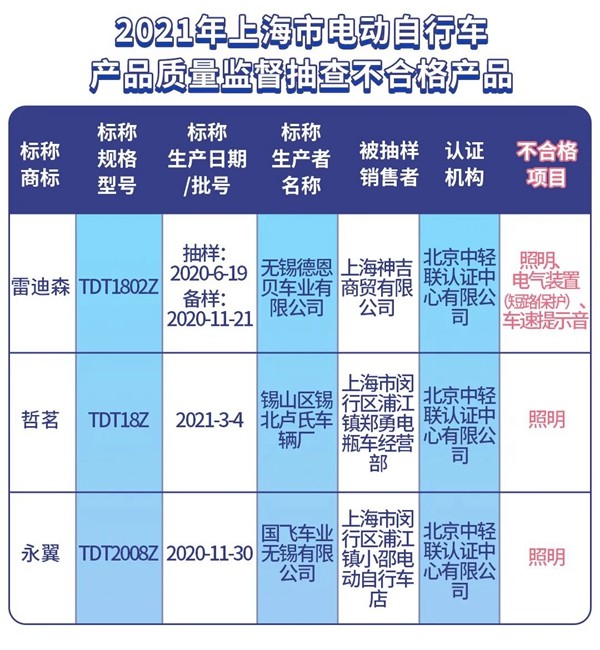 抽查结果显示,不合格电动自行车涉及的品牌有雷迪森、哲茗以及永翼,存在的问题如下: