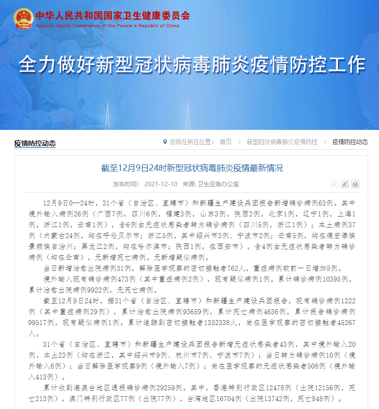 截至12月9日24时,据31个省(自治区、直辖市)和新疆生产建设兵团报告,现有确诊病例1222例(其中重症病例29例),累计治愈出院病例93659例,累计死亡病例4636例,累计报告确诊病例99517例,现有疑似病例1例。累计追踪到密切接触者1352338人,尚在医学观察的密切接触者45267人。