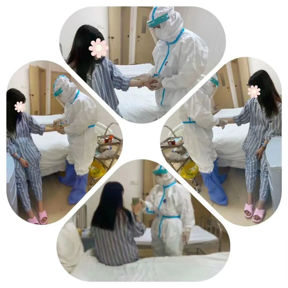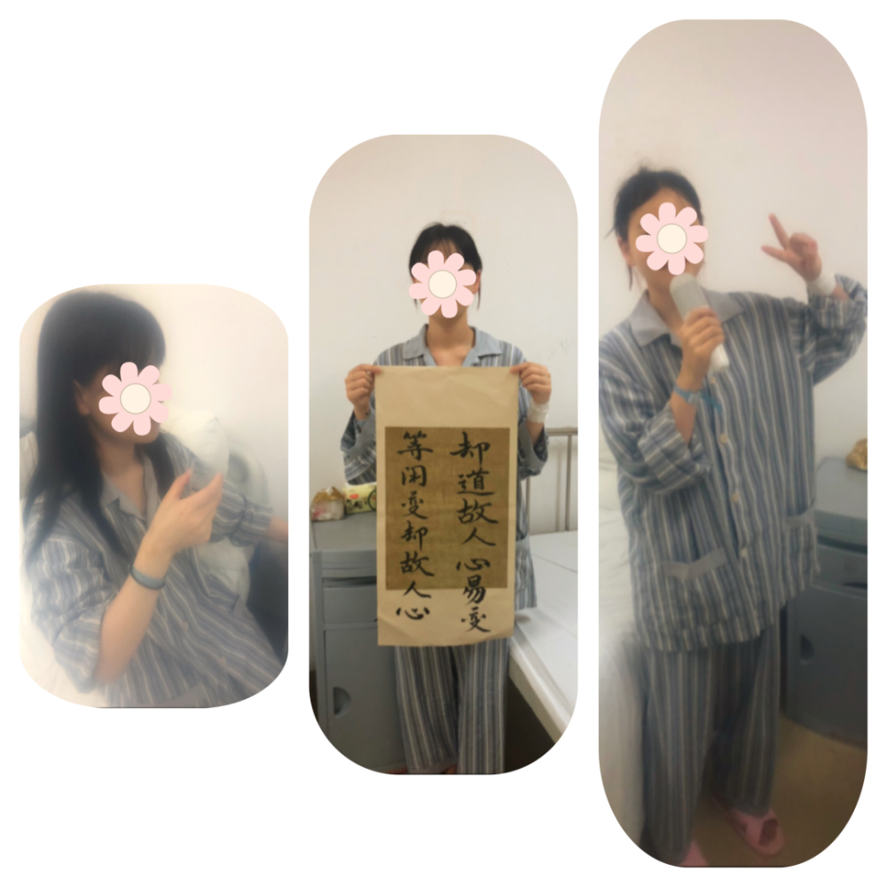 随着治疗的推进,小雨的情绪明显好转,配合度也有了大幅度的提升。专职护士陆乐为了能“投其所好”,特地联系了小雨的闺蜜,询问其兴趣爱好。得知小雨平时兴趣广泛,是个动静皆宜的女生。便为其制定了一整套的康复计划:上午书法、绘画;下午唱歌、健身操、阅读......隔离病室从之前的鸦雀无声,到现在不时传出的音乐声、歌声、欢笑声,这些都离不开医生和护士们的辛勤付出。尽管防护服密不通风,汗水顺额头留下,浸入口鼻却不能擦拭,但工作人员从未懈怠。每每下班交接,卸下大白,脱去N95,通红的脸颊,深深的印痕,浸湿的刘海和工作服,大口的喘气声......这些成为了我们走出入境隔离病室的标配。