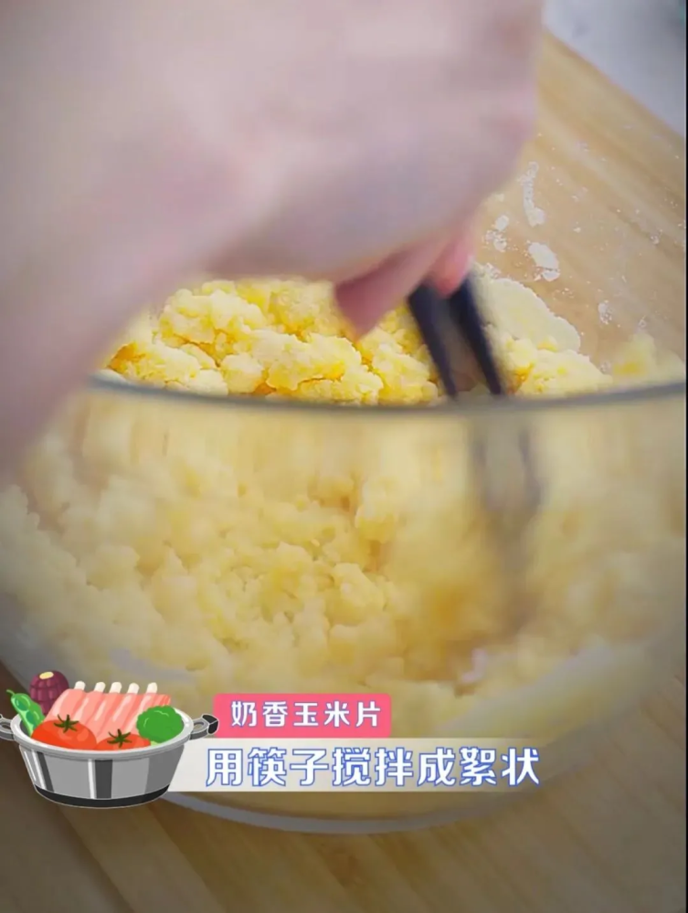 2、将玉米粉、面粉、黄油、牛奶用筷子搅拌成絮状