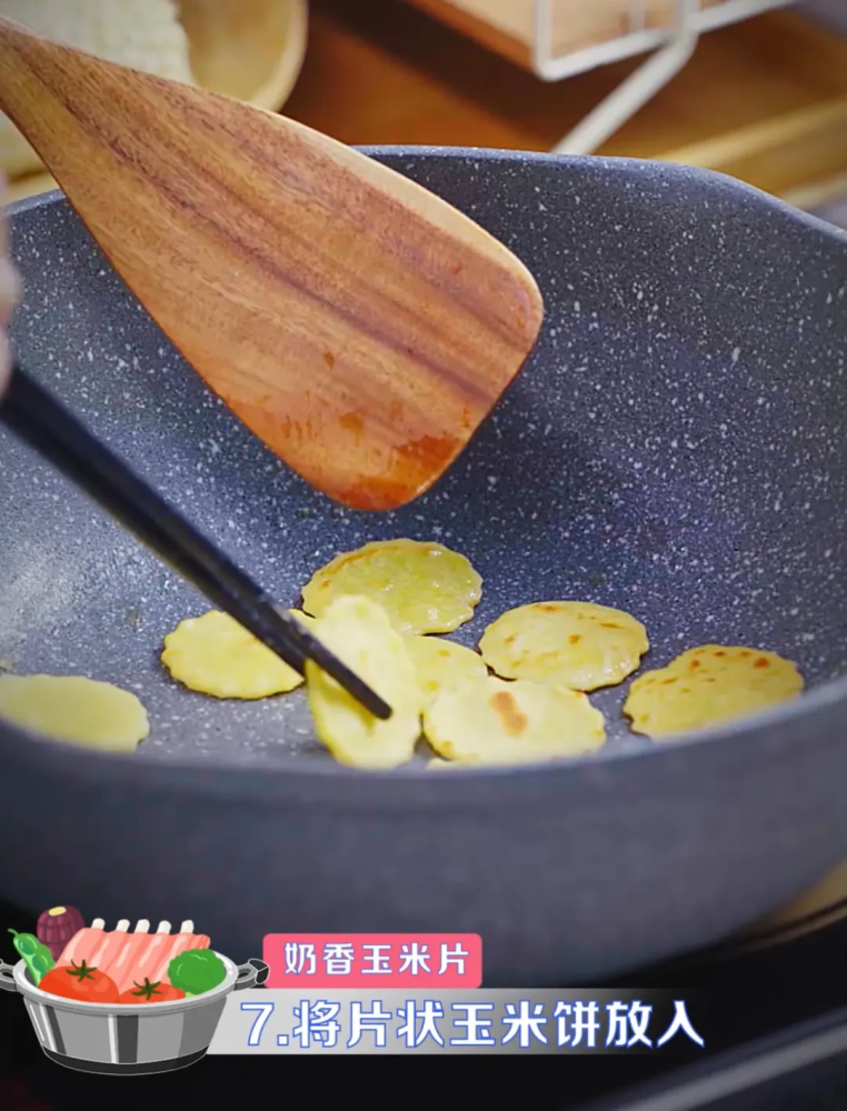 7、将片状玉米饼放入,煎至底部金黄
