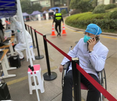 昨日,相信不少人都在朋友圈看到这样一张“揪心”的照片:一位医生正坐着轮椅、手拿电话在医院核酸检测点指挥引导现场工作。
