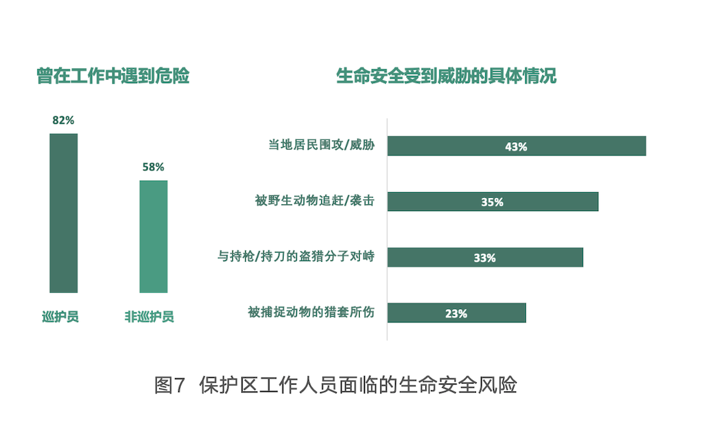 八成以上的巡护员表示在工作中遇到过危险,其中大部分来自当地居民围攻/威胁。