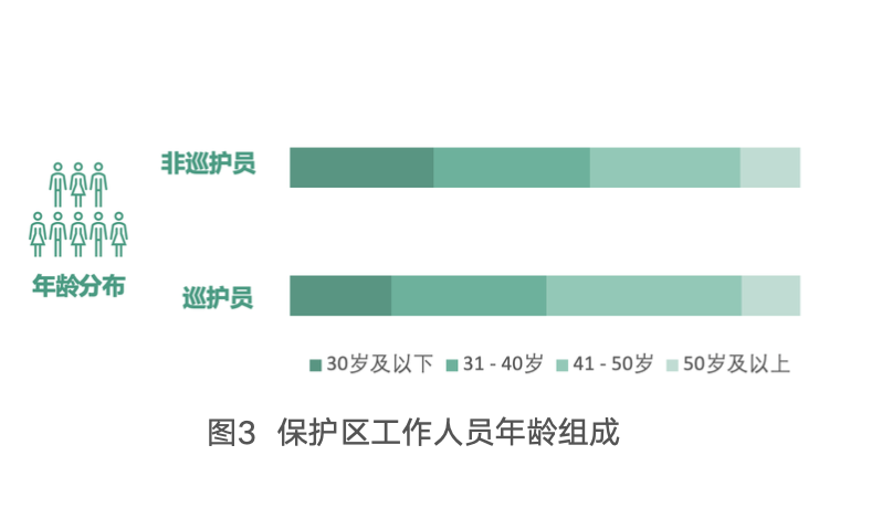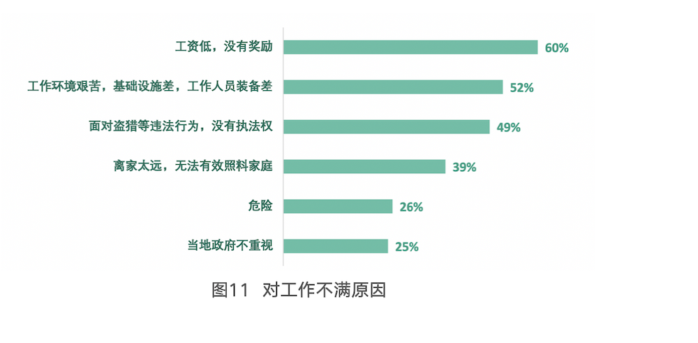 调查发现,保护区巡护员呈现出“老龄化”、“青黄不接”的现象,年轻人才流失率高;约有三分之一的工作人员想过辞职,主要原因为工资待遇低、工作条件差、离家人太远等等;近一半工作人员认为没有接受足够的职业培训;超七成的工作人员表示择业的原因是出于对大自然和野生动物的喜爱......