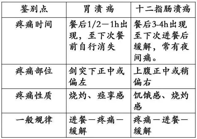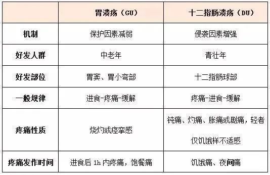 2. 胃溃疡和十二指肠溃疡临床表现不同 ,见下表: