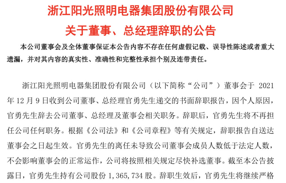 12月10日,阳光照明发布公告称,董事、总经理官勇因个人原因,辞去该公司董事、总经理及董事会相关职务,之后官勇也不再担任该公司任何职务。值得关注的是,官勇担任阳光照明总经理已超13年,是公司当之无愧的“老将”。