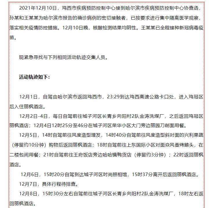 12月10日,黑龙江鸡西市疾病预防控制中心接到哈尔滨市疾病预防控制中心协查函,孙某和王某某为哈尔滨市报告的确诊病例的密切接触者,已按要求进行集中隔离医学观察,落实相关疫情防控措施。12月10日晚,核酸检测结果均为阴性。王某某已全程接种新冠病毒疫苗。