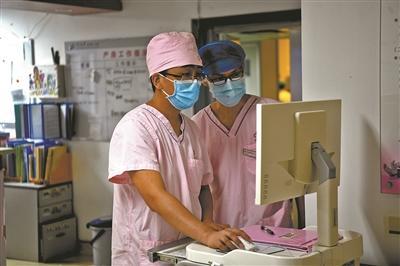 产房外,郭志东与同事将产妇情况变化认真录入电脑中。