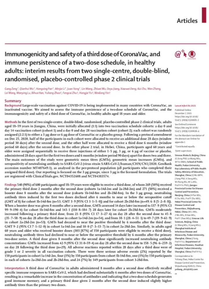 央广网北京12月12日消息 日前,由河北省疾控中心、江苏省疾疾控中心、复旦大学公共卫生学院公共卫生安全重点实验室、科兴控股生物技术有限公司(SINOVAC科兴)等多家单位合作,在世界权威传染病期刊《柳叶刀-感染病学》(以下简称“杂志”)发表了健康成年人接种两剂SINOVAC科兴新冠病毒灭活疫苗克尔来福的免疫持久性,第三剂接种后免疫原性和安全性双盲、随机、安慰剂对照Ⅱ期临床研究结果(Immunogenicity and safety of a third dose of CoronaVac, and immune persistence of a two-dose schedule, in healthy adults: interim results from two single-centre, double-blind, randomised, placebo-controlled phase 2 clinical trials)。