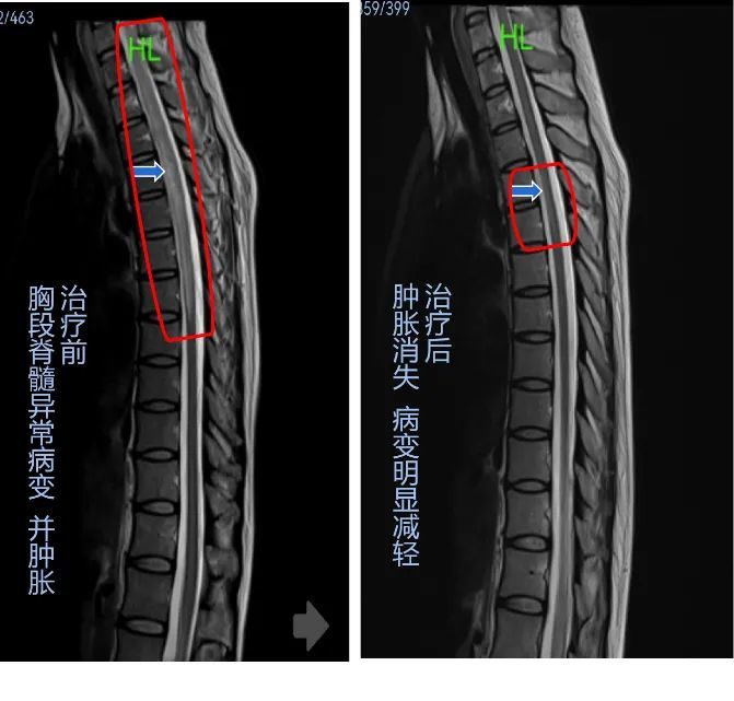经过治疗后,赵瑛的病情明显好转。拍片显示,原来发炎的8节段脊髓,已经缩小到2个而且异常信号已经很淡, 抗体指标也大大改善。