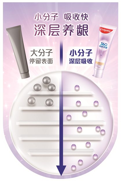 “我们可以把牙龈看作皮肤,和护肤品中的小分子比大分子成分更容易被皮肤吸收一样,小分子成分其实更加有利于牙龈快速吸收,作用直达基底。”高露洁产品负责人向《消费者报道》解释。