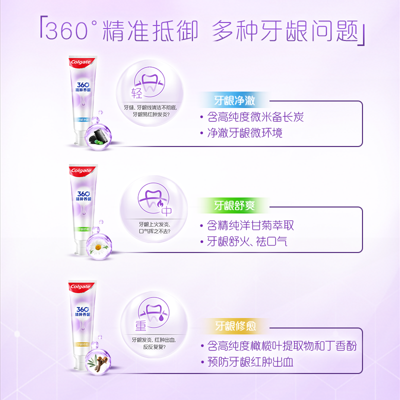 值得一提的是,高露洁360°精粹养龈牙膏还有三位“家庭成员”,为遇到不同程度牙龈问题的消费者带来更加精准的牙龈护理保障。