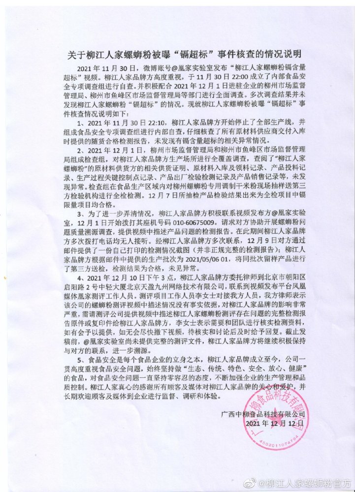 柳江人家螺蛳粉透露,2021年12月1日,柳州市场监督管理局和柳州市鱼峰区市场监督管理局组成检查组,对柳江人家品牌方生产场所进行全覆盖调查,查阅了“柳江人家螺娜粉"的原材料供货方的相关供货证明、原材料入库及领料记录、产品投料记录、生产过程关键控制点记录、产品出厂检验检测记录及产品销售记录等,未发现异常。检查组在食品生产区域内对柳州螺蜘粉专用调制干米粉现场抽样送第三方检验机构进行全检检测。12月7日所抽检产品检验结果出来为全检项目中镉限量项目均合格。