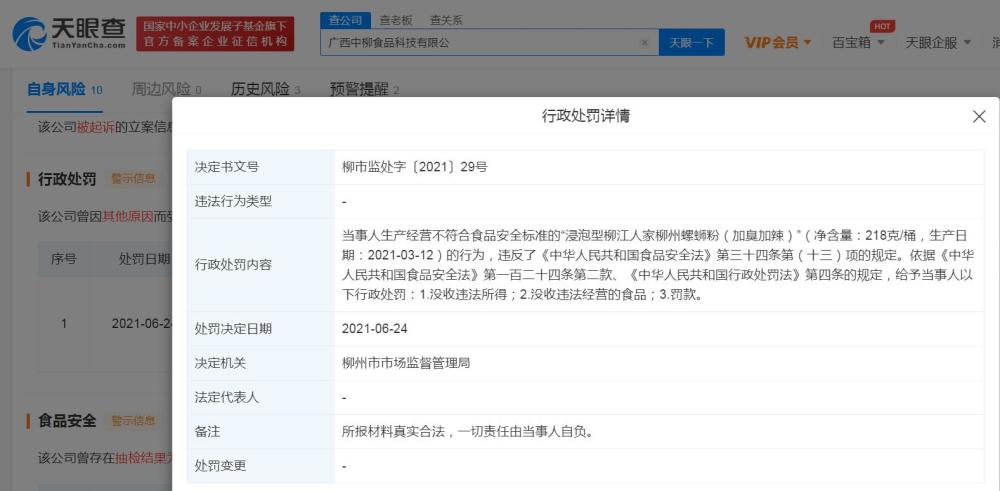 天眼查APP数据显示,今年6月24日,柳州市市场监管局曾对广西中柳食品科技有限公司进行处罚。处罚详情显示,当事人生产经营不符合食品安全标准的“浸泡型柳江人家柳州螺蛳粉(加臭加辣)”(净含量:218克/桶,生产日期:2021-03-12)的行为,违反了《中华人民共和国食品安全法》第三十四条第(十三)项的规定。依据《中华人民共和国食品安全法》第一百二十四条第二款、《中华人民共和国行政处罚法》第四条的规定,给予当事人以下行政处罚:没收违法所得、没收违法经营的食品、罚款。(中新经纬APP)