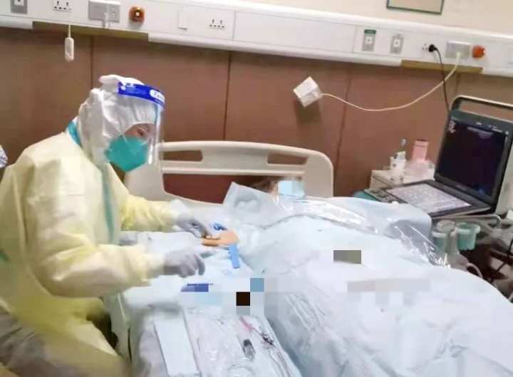 穿着厚重的防护服,戴着防护面罩、口罩、护目镜,这身行头足以让人呼吸急促,在B超引导下,王利虹进行了高难度的隔离病区内PICC置管操作,成功为患者打开静疗通道。