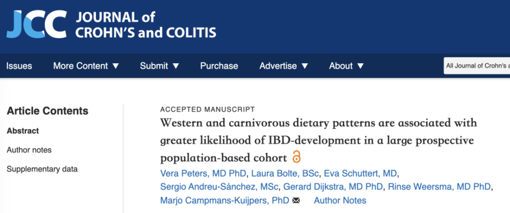 [1] Vera Peters. Et al. Western and carnivorous dietary patterns are associated with greater likelihood of IBD-development in a large prospective population-based cohort . Journal of Crohn's and Colitis.2021.