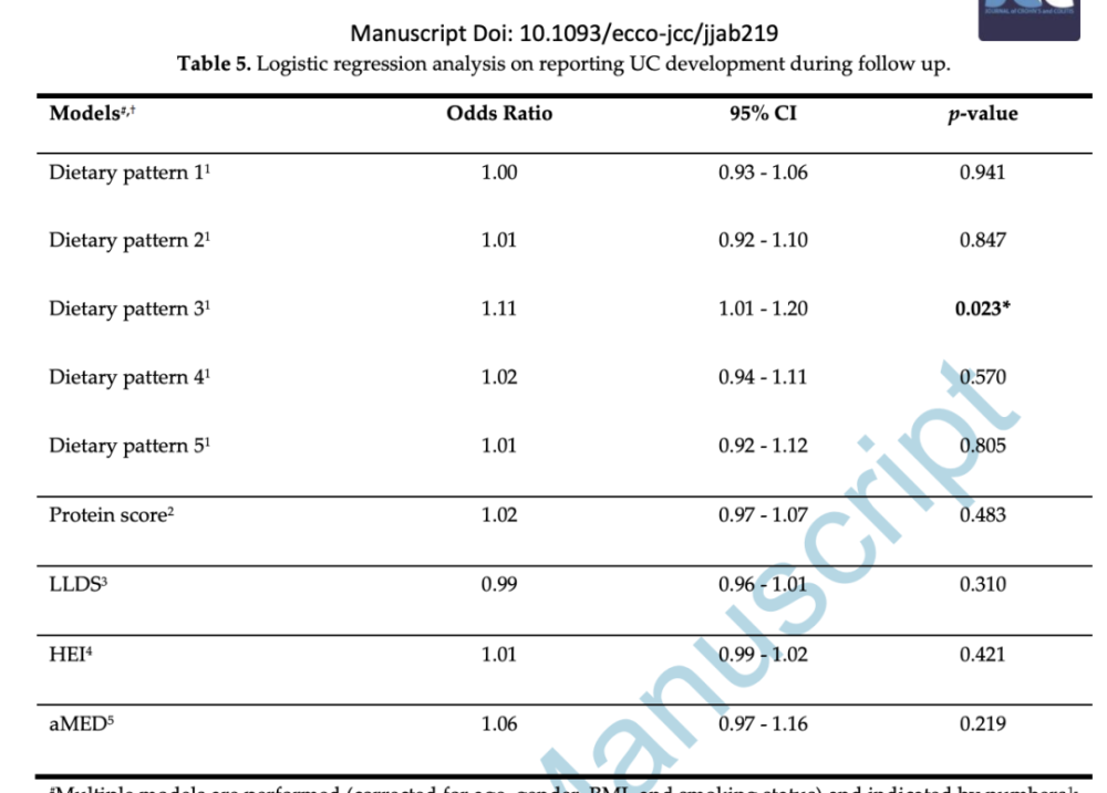本项研究共纳入125445人,在14年的随访时间中,有224发展为UC,有97人发展为 CD。所有参与者在基线时都填写了与健康相关的饮食问卷 (FFQ)。研究人员对研究数据进行主成分分析 (PCA) 以推导出事后饮食模式,包括蛋白质评分、健康饮食指数、LifeLines 饮食评分 (LLDS) 和替代地中海饮食评分。在饮食模式、分数和 IBD 发展之间进行逻辑回归模型评估所有变量之间的相关性。