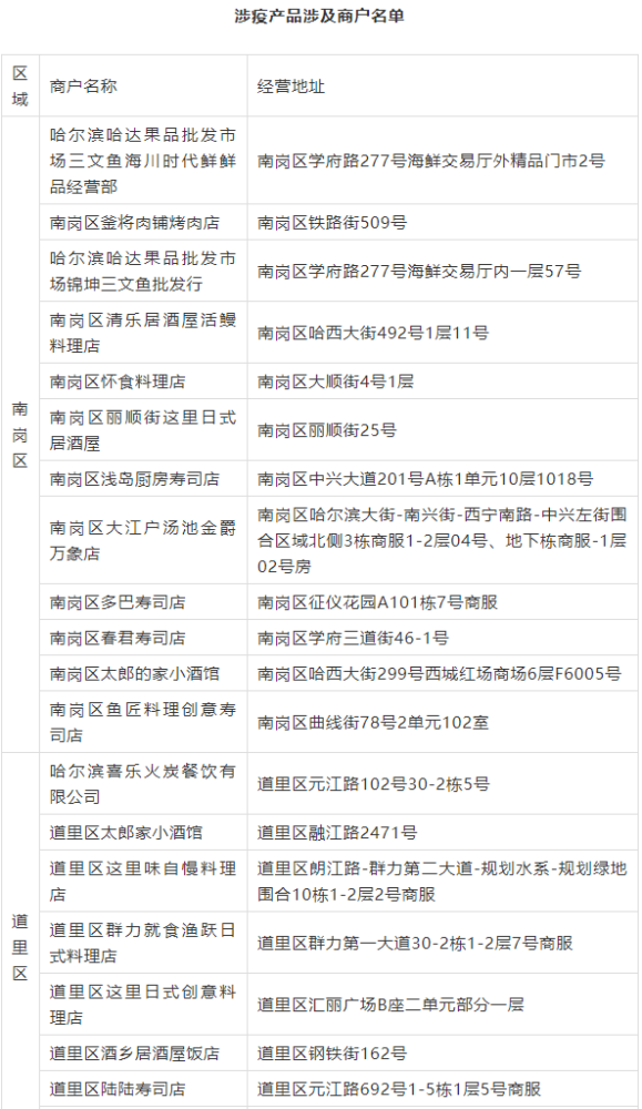 一、请2021年11月1日至12月12日期间在以下商户购买和食用俄罗斯冻北极甜虾的市民朋友,在做好个人防护的前提下,将尚未食用的俄罗斯冻北极甜虾原地封存,并第一时间报告属地市场监管部门等候处置;接触和食用俄罗斯冻北极甜虾的市民朋友要向所在社区(村屯)主动报告,并积极配合落实筛查、检测、管控等防控措施。