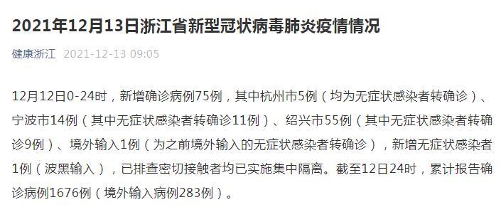 中国网12月13日讯 据浙江省卫生健康委员会微信公众号消息,12月12日0-24时,新增新冠肺炎确诊病例75例,其中杭州市5例(均为无症状感染者转确诊)、宁波市14例(其中无症状感染者转确诊11例)、绍兴市55例(其中无症状感染者转确诊9例)、境外输入1例(为之前境外输入的无症状感染者转确诊),新增无症状感染者1例(波黑输入),已排查密切接触者均已实施集中隔离。截至12日24时,累计报告确诊病例1676例(境外输入病例283例)。