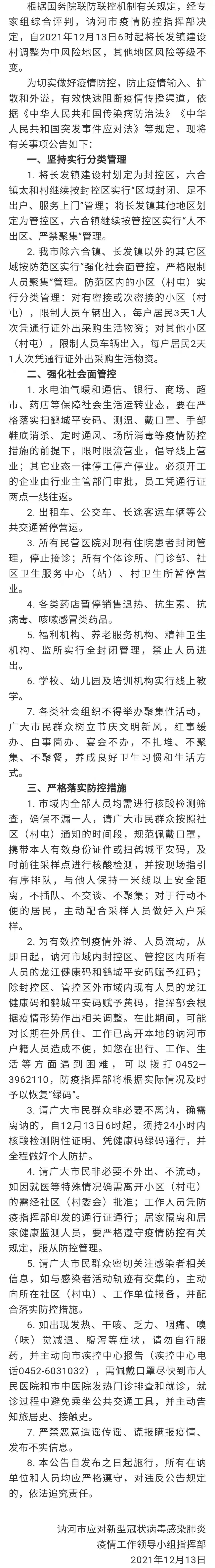 根据国务院联防联控机制有关规定,经专家组综合评判,讷河市疫情防控指挥部决定,自2021年12月13日6时起将长发镇建设村调整为中风险地区,其他地区风险等级不变。