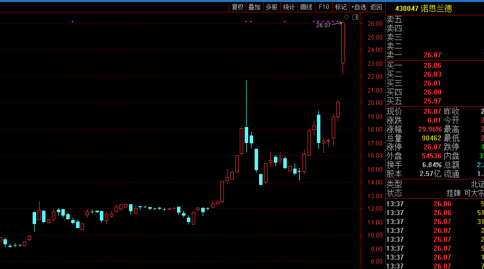 12月13日午后,北交所诺思兰德触及涨停。截至发稿报26.07元,涨29.96%。近10个交易日累计涨幅75%,年内涨幅147%。