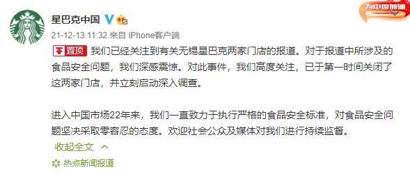 - 星巴克回应无锡两门店食品安全问题:深感震惊,已关闭涉事门店,启动调查2021-12-13 14:00:53