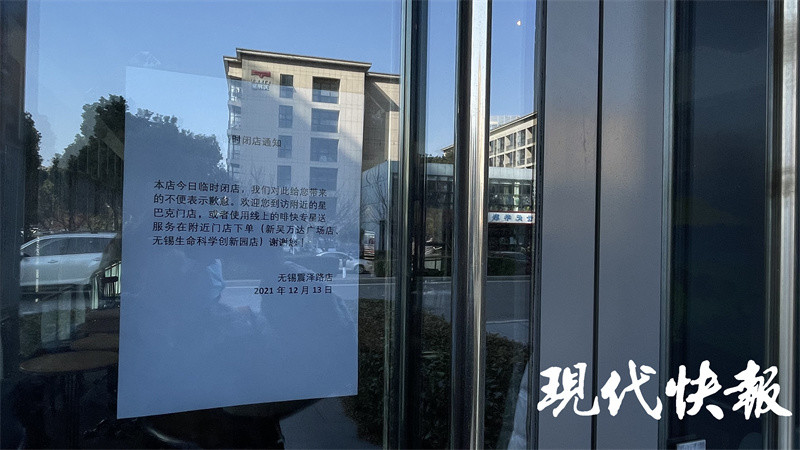 12月13日下午1点左右,现代快报记者前往无锡星巴克震泽路店,发现门店已经关闭,大门玻璃上贴着一份闭店通知,上面写着“本店今日临时闭店,我们对此给您带来的不便表示歉意……”在附近上班的李女士说:“我们平时比较喜欢喝咖啡的,具体现在什么情况,也希望赶紧调查清楚吧!”