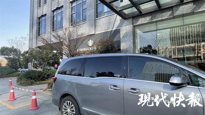 △星巴克无锡昌兴大厦店门口停放着执法车