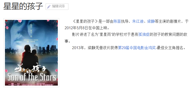 同样关于自闭症的影视作品并不罕见,在2012年5月份我国就上映过一部电影,《星星的孩子》,这部电影的女主角还获得了二十九届中国电影金鸡奖。