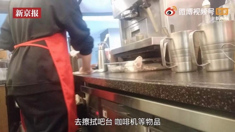 暗访视频也显示,无锡多家星巴克门店,均承诺开封后的糕点如果卖不掉,会在当天报废,但实际上一些隔夜的糕点又在次日上架售卖;另外,星巴克店员还会用擦过垃圾桶的毛巾简单清洗后,继续擦拭吧台和咖啡机。