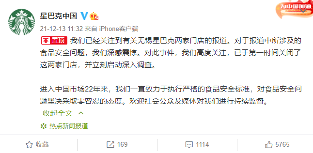 12月13日,星巴克中国官方微博就此前媒体报道的门店使用过期食材等问题作出了回复:我们已经关注到有关无锡星巴克两家门店的报道。对于报道中所涉及的食品安全问题,我们深感震惊。对此事件,我们高度关注,已于第一时间关闭了这两家门店,并立刻启动深入调查。
