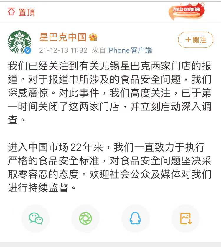 12日中午,星巴克中国官方微博“星巴克中国”针对此事发文致歉,称高度关注,已于第一时间关闭了这两家门店,并立刻启动深入调查。致歉声明还指出,星巴克一直致力于执行严格的食品安全标准,对食品安全问题坚决采取零容忍的态度,欢迎社会公众及媒体进行持续监督。