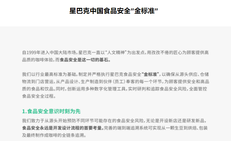 记者在星巴克中国官网上看到,星巴克承诺:“我们以行业最高标准为基础,制定严格执行星巴克食品安全‘金标准’,以确保从源头供应、仓储物流到门店运营,从产品设计、生产制造到伙伴(员工)奉客的每一个环节,为顾客提供安全和高品质的食品和饮品。”
