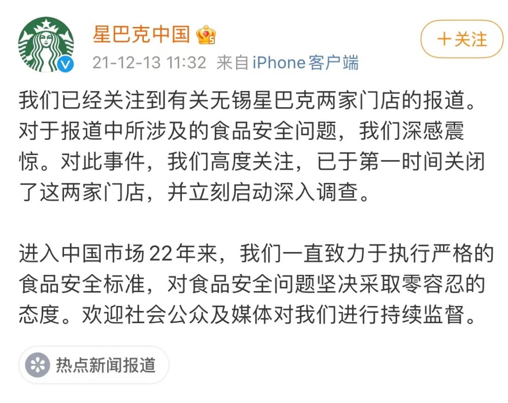 12月13日,星巴克被曝出食品安全问题。据新京报报道,记者近日在星巴克无锡昌兴大厦店和无锡震泽路店卧底调查。从披露的视频来看,星巴克存在使用过期原材料问题,包括巧克力液、抹茶液、奶油、桃果肉等;此外,还存在店员撕掉过期原料标签、篡改原料保质期、隔夜蛋糕依然上架等行为。其中一家门店的主管甚至要求卧底记者使用吧台毛巾去擦垃圾桶外壁,擦完后经过简单清洗继续放吧台使用。星巴克中国今天回应称:对报道中所涉及的食品安全问题深感震惊,已于第一时间关闭了两家涉事门店,并立刻启动深入调查。