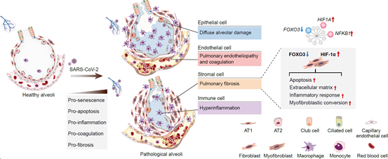 研究系统解析了新冠患者肺组织中多种细胞类型的疾病变化规律,首次鉴定了新冠肺炎患者肺的加速衰老表型,为新冠病毒感染导致的老年人致死率增加及预后的多种后遗症提供了可能的解释。