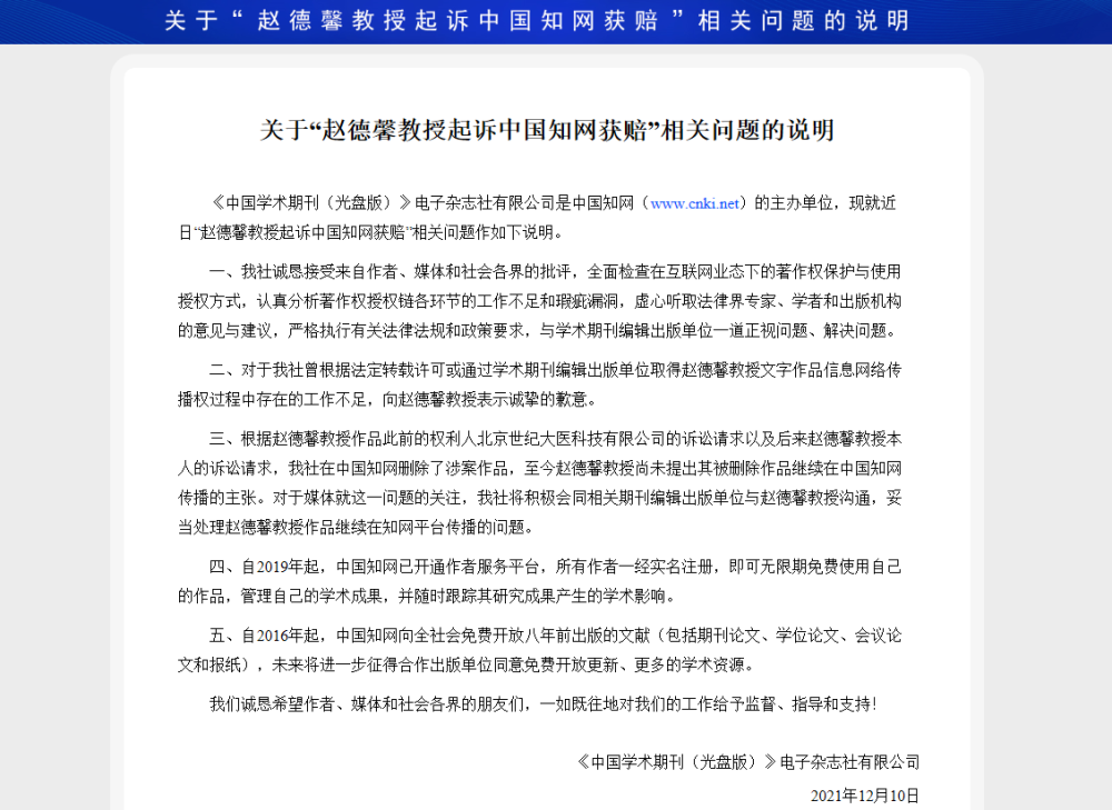 12月10日,中国知网发布说明,表示向赵德馨教授道歉,同时全面检查在互联网业态下的著作权保护与使用授权方式,认真分析著作权授权链各环节的工作不足和瑕疵漏洞。阅读全文>>>