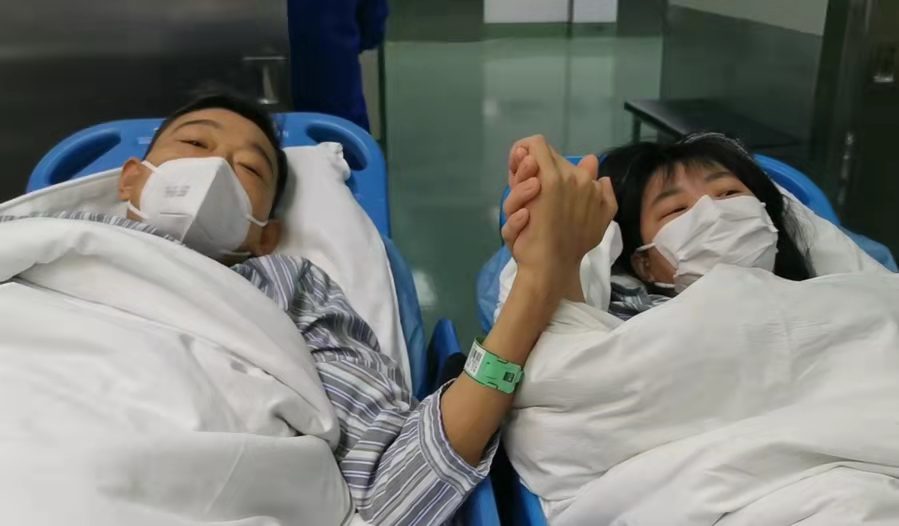 2021年12月7日,复旦大学附属华山医院,在手术前,夫妻俩还握了握手。本文图片均为华山医院 供图