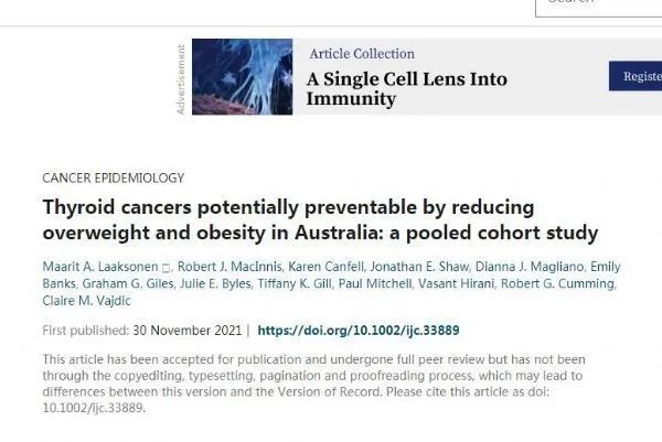 Maarit A. Laaksonen,Robert J. MacInnis,Karen Canfell, et al. Thyroid cancers potentially preventable by reducing overweight and obesity in Australia: a pooled cohort study, International Journal of Cancer (2021). DOI:10.1002/ijc.33889